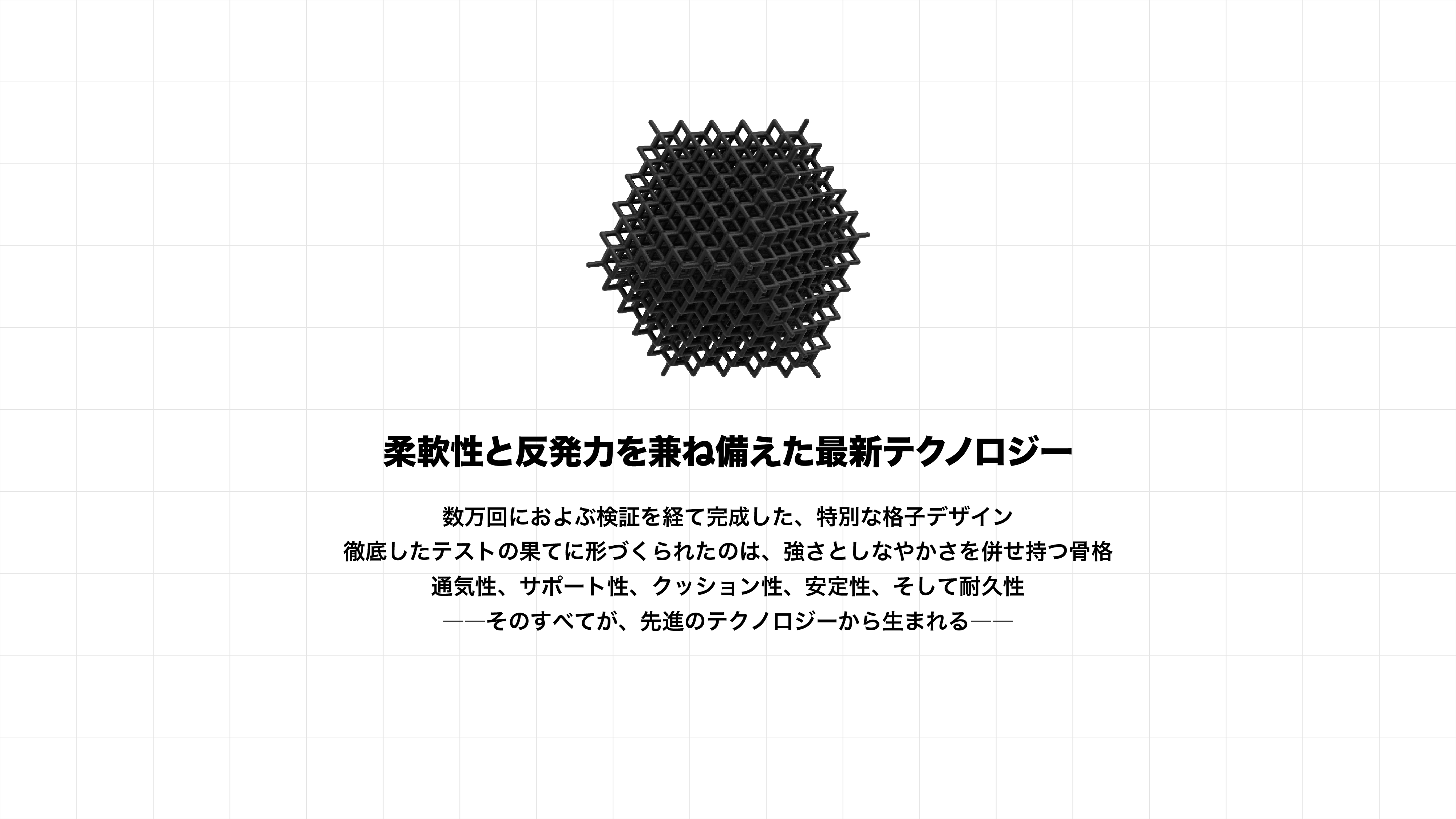 最先端技術により部位ごとに柔らかさと硬さを精密に調整。歩行時の衝撃を吸収するクッション性と、長期間使用でも潰れにくい高反発性を兼ね備えています。